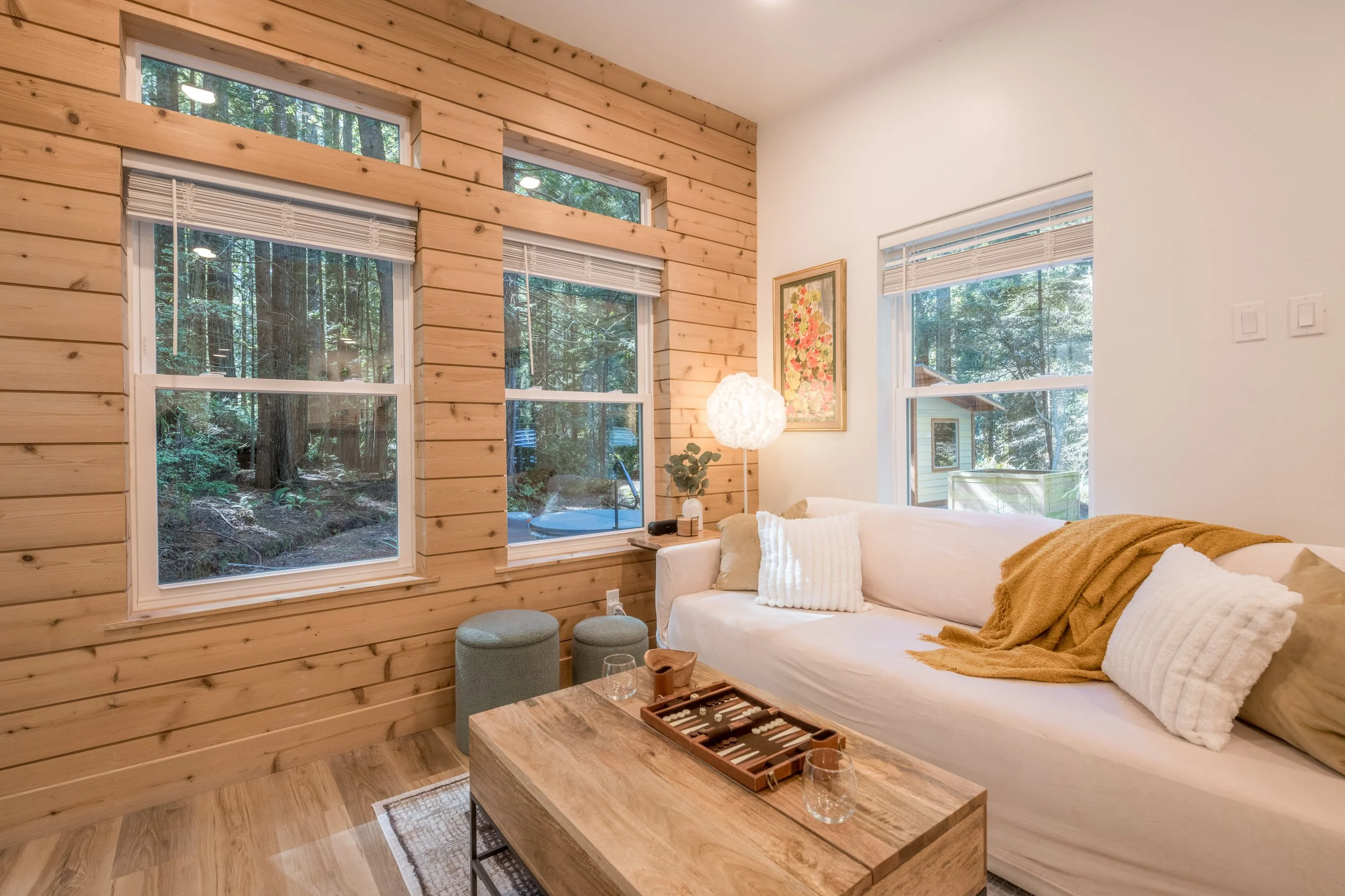 As the light fades through the canopy, slip into the hot tub and let the day dissolve. Dine outside under the redwoods, then move inside to the plush couch, a bottle of wine, and whatever you feel like watching on the 55" Smart TV. The cedar wall glows warmly, the lights dim down low, and there's nothing left to do but be here together.